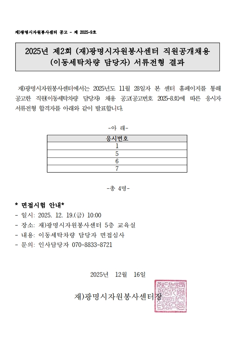 2025년 제2회 (재)광명시자원봉사센터 직원 공개채용 (이동세탁차량 담당자) 서류전형 결과공고