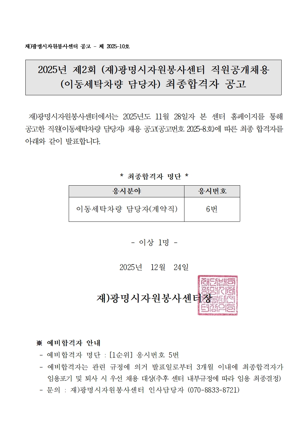 공고한 직원(이동세탁차량 담당자) 채용 공고(공고번호 2025-8호)에 따른 최종합격자를 아래와 같이 발표합니다.